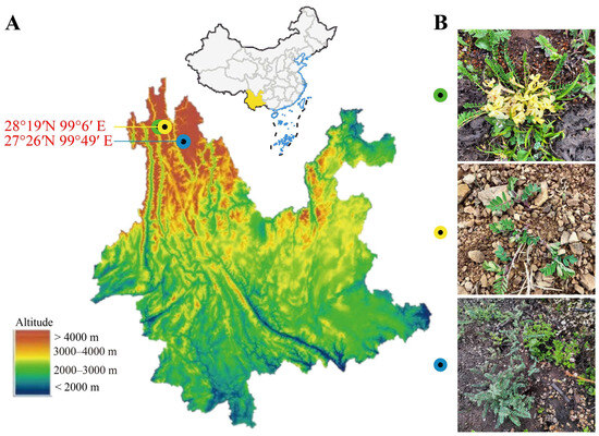 Map of sampling sites in the northwestern area of Yunnan province, China (A). In the picture (B), the green dot is the sampling site for Astragalus acaulis growing in high-altitude grassland at 4353 m; as shown in the yellow dot, A. ernestii grows in the steep slopes of flowstone beaches at 4048 m; and the blue dot shows the A. forrestii survival environment, surrounded by more pine trees and deciduous foliage at 3225 m.
