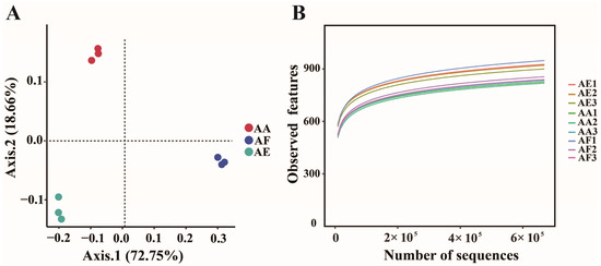 Principal coordinate analysis (PCoA) (A) and rarefaction curves of nine rhizosphere soil samples (B) of Astragalus forrestii (AF), A. acaulis (AA), and A. ernestii (AE).
