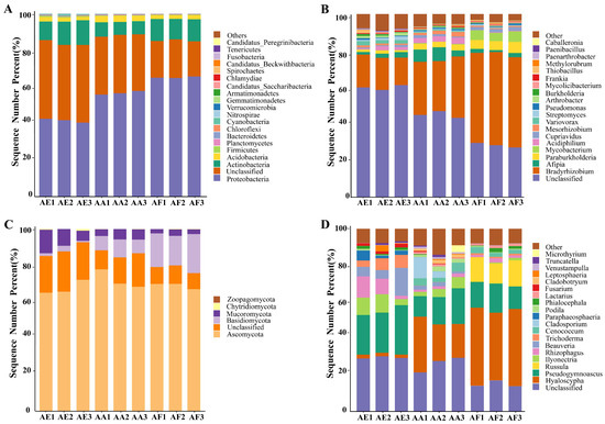 Taxonomical composition of rhizosphere microbial communities in the three Astragalus species of A. forrestii (AF), A. acaulis (AA), and A. ernestii (AE) at different taxonomic levels. The relative abundance of bacteria at the phylum (A) and genus (B) levels, and fungi at the phylum (C) and genus (D) levels.