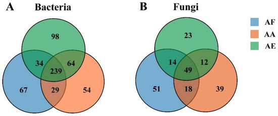 Venn diagram showing the number of bacteria (A) and fungi (B) at the genus level in the rhizosphere soil samples of Astragalus forrestii (AF), A. acaulis (AA), and A. ernestii (AE). Each circle, with a different color in the diagram, represents the number of species specific to the corresponding subgroup. Middle core numbers represent the number of genera common to all groups.