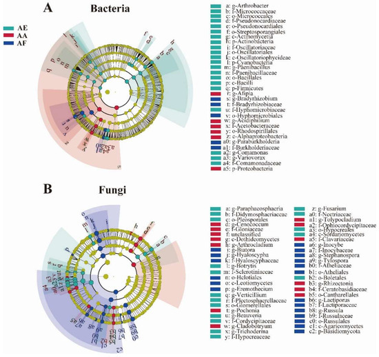 LEfSe analysis shows the different bacterial (A) and fungal (B) biomarkers in the rhizosphere of Astragalus forrestii (AF), A. acaulis (AA), and A. ernestii (AE). Differently colored regions represent different constituents, with the diameter of each circle being proportional to the relative abundance of the taxon. The inner to outer circle corresponds to the taxonomic levels, from the phylum to the genus.