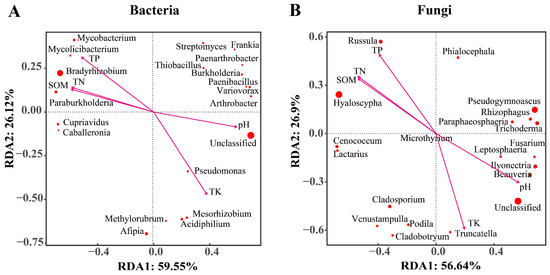 Correlations between soil physicochemical properties and the community structure for bacteria (A) and fungi (B), as determined by redundancy analysis at the genus level. The environmental factors are represented by arrows; each point represents a genus, and the larger the point, the higher the abundance of the corresponding genus.