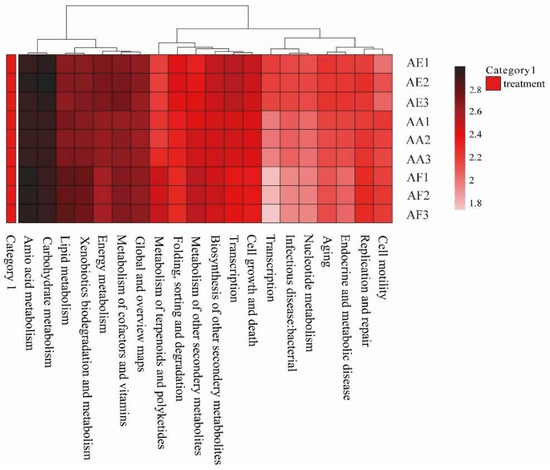 Heat map showing the abundance of level 2 KEGG metabolic pathways of the rhizosphere microorganisms of Astragalus forrestii (AF), A. acaulis (AA), and A. ernestii (AE).