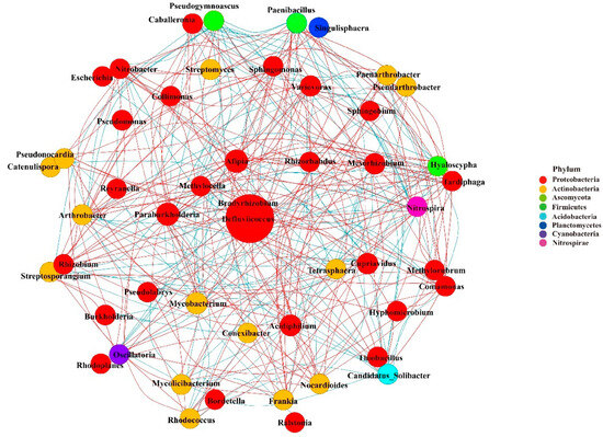 Co-occurrence network analysis was used to evaluate the complexity of the interactions between microorganisms detected in the rhizosphere of three Astragalus species (top 50 genera) (Figure 8 and Table S25). The networks consisted of 43 nodes and 119 edges. These genera mainly belong to Proteobacteria and Actinobacteria, with most belonging to Proteobacteria. The top genera, Bradyrhizobium, were identified as hub biomarkers in the rhizosphere due to their high abundance. These microbial communities constituted 62 positive correlations and 57 negative correlations. Among them, Bradyrhizobium was significantly positively correlated with Paraburkholderia and negatively correlated with Variovorax.