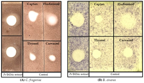 Bioautography assays depicting the antifungal activity of P. vancouverensis EtOAc extract. A total of 10 µL (100 µg) EtOAc extract was spotted onto a silica gel plate. The clear “zone of inhibition” represents the antifungal activity of the crude extract against the fungal pathogens (A) C. fragariae and (B) B. cinerea.