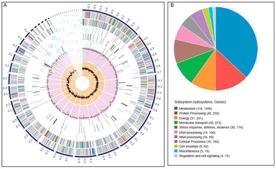 (A) Circos plot depicting the distribution of genome annotations in the Pseudomonas vancouverensis genome. From the outer to inner rings: contigs, CDS on the forward strand, CDS on the reverse strand, RNA genes, CDS with similarity to known antimicrobial resistance genes, CDS homologous to known virulence factors, GC content, and GC skew. The numbers on each contig (outermost ring) indicate physical positions in Mbp. The color bands of CDS on forward and reverse strands indicate different sub-systems that those genes are predicted to be involved in. The code for each color is in the legend of the adjacent pie chart. (B) Pie chart displaying the distribution of sub-systems in the P. vancouverensis genome.