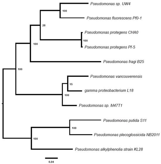 A phylogenetic analysis based on the sequences of global protein families (Table S1) indicated that P. vancouverensis is closely related to gamma proteobacterium L18, followed by Pseudomonas sp. M47T1, P. fragi, P. protegens, and P. fluorescens, respectively (Figure 4). Among the Pseudomonas species, three species, namely putida, plecoglossicida, and alkylphenolia were identified as relatively distant relatives of P. vancouverensis (Figure 4).