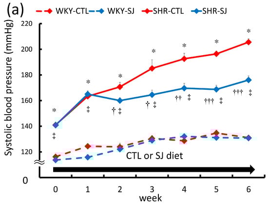 Systolic blood pressure (a) and mean arterial blood pressure (b) in WKYs or SHRs fed CTL or SJ for 6 weeks. Values are mean ± SE, n = 4–5. (a) Three-way ANOVA: p < 0.001 for time, animal (WKYs vs. SHRs), and diet and each interaction except time × diet (p < 0.01). * p < 0.001 vs. WKY-CTL, † p < 0.05, †† p < 0.01, and ††† p < 0.001 vs. SHR-CTL, ‡ p < 0.001 vs. WKY-SJ. (b) Two-way ANOVA: p < 0.0001 animal, p < 0.05 diet and interaction animal × diet. * p < 0.01 vs. WKY-CTL, † p < 0.05 vs. SHR-SJ. The following abbreviations were used: WKY, Wistar Kyoto rats; SHR, spontaneously hypertensive rats; CTL, a control diet; SJ, a diet with Saccharina japonica; SE, standard error; ANOVA, analysis of variance.