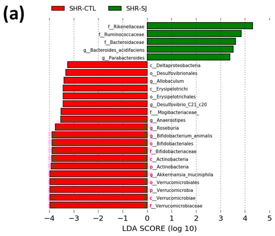 The relative abundances of Firmicutes, Bacteroidetes, and Proteobacteria were not significantly changed with the intake of an SJ diet in SHRs. In contrast, Verrucomicrobia and Actinobacteria were significantly decreased in SHR-SJ compared with SHR-CTL (p < 0.05, Table 1). At the family level, the relative abundance of Rikenellaceae significantly increased in SHR-SJ compared with SHR-CTL. Conversely, the relative abundances of Verrucomicrobiaceae, Mogibacteriaceae, and Bifidobacteriaceae significantly decreased in SHR-SJ compared with SHR-CTL (Figure 4a). At the genus level, the relative abundances of Roseburia, Anaerostipes, Akkermansia, and Desulfovibrio were significantly decreased in SHR-SJ compared with SHR-CTL (Figure 4b). At the species level, Bacteroides acidifaciens significantly increased in SHR-SJ compared with SHR-CTL. In contrast, the relative abundances of Akkermansia mushiniphira and Desulfovibrio C21_c20 were significantly decreased in SHR-SJ compared with SHR-CTL (Figure 4c). Furthermore, LEfSe analysis revealed that the relative abundances of 5 bacterial taxa were significantly increased, and 19 bacterial taxa were significantly decreased in SHR-SJ compared with SHR-CTL (Figure 5). These data indicate that SJ consumption may alter the composition of gut microbiota in SHR.