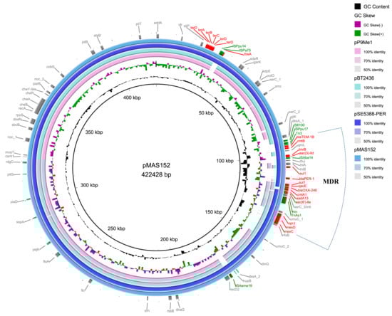 The genome of MAS152 consists of a 7,026,323 bp circular chromosome with a GC content of 65.89% and is identified as MLST sequence type ST357. The plasmid, pMAS152, 422,428 bp with 56.63% GC content, has 538 predicted coding sequences, of which 72% encode proteins of undetermined function (Figure 1 and Table S2). Comparing the complete sequence of pMAS152 with the plasmid sequence in Genbank, pMAS152 has the highest similarity to the plasmid pSE5388-PER (accession number: MT598646.1) from P. aeruginosa stain SE5388 (both identity and coverage can reach 99%). In addition, pMAS152 has high similarity with the plasmids pTJPa150 (CP094678.1), pBT2436 (CP039989.1), and pP9Me1 (CP118639.1), all carried by P. aeruginosa and isolated from China, Thailand, and Egypt (Figure 1). The main difference between the plasmid pMAS152 and its similar plasmids lies in the region where the resistance genes gather, as well as the region where conjugation-related genes are distributed.