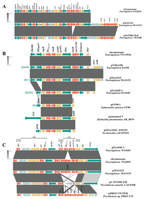 Schematic presentation of MDR region. Genes are presented as arrows, with the arrowhead indicating the direction of transcription. Genes involved in antimicrobial resistance are in orange, mobile elements are in green, genes involved in other functions are in yellow, and genes involved in undetermined coding functions are in light gray. Homologous segments generated by a BLASTn comparison (>65% identity) are gray boxes. Alignment of genetic contexts of the MDR region with a length of 44.8 kb (A), rmtB (B), and blaPER-1 (C) in the plasmid pMAS152-MDR with similar sequences.