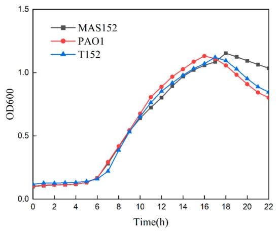 Growth kinetics studies have shown that there is no significant difference between the donor strain MAS152, recipient strain PAO1, and transconjugant T152 by comparing the lag phase and logarithmic phase across strains (Figure 3). In contrast to the donor strain MAS152, which exhibits a prolonged and gradual stationary phase, both the receptor strain PAO1 and the transconjugant T152 demonstrate a minimal stationary phase and rapidly transition into the decline phase following the logarithmic phase. The highly similar growth curves of the receptor strain PAO1 before and after conjugation indicate that the plasmid may not impose an additional growth burden on the receptor bacteria.