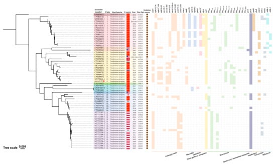 Plasmid sequences with at least 80% homology to the plasmid pMAS152 sequence in NCBI (n = 60) were screened for phylogenetic tree construction (Table S1). GGDC 3.0 (Genome to Genome Distance Calculator 3.0, https://ggdc.dsmz.de/ggdc.php#, accessed on 6 November 2023) was employed to generate distance matrices, using the online website FastMe2.0 (http://www.atgc-montpellier.fr/fastme/, accessed on 8 November 2023) based on NJ method to infer phylogeny, and using chiplot for beautification [19].
