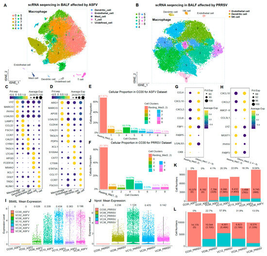 Single-cell transcriptome landscape in ASFV-infected and PRRSV-infected BALF Cells. (A,B) The TSNE plots of BALF cells in the ASFV-infected dataset and PRRSV-infected dataset, colored to show cluster information. (C,D) The bubble charts of the marker gene expression levels for identifying cell types in the ASFV-infected dataset and PRRSV-infected dataset, with brightness indicating log-normalized average expression and circle size indicating the percentage expressed. (E,F) Proportion of each cellular cluster in CC00 sample for two datasets. (G,H) The bubble charts of the top five gene expression levels in CC00 cellular clusters for two datasets. (I,J) Violin diagram of the expression levels for B646L and Nprot at different infection times. (K,L) The cell numbers and the proportions of B646L-expressing cells and of N-expressing cells at different infection times.