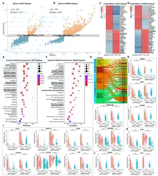 Common immune responses of PAMs caused by the infection of ASFV and PRRSV. (A,B) The volcanic map of single-cell transcriptome difference analysis for Virus_Cell vs. Resting_CC00 in the ASFV dataset and PRRSV dataset, respectively. Each point in the figure represents each gene. The X-axis represented the value of difference, which is the difference between pct.1 and pct.2, where pct.1 represented the average expression percentage of the gene in the cellular group of Virus_Cell, and pct.2 represented the average expression percentage of the gene in the cellular group of Resting_CC00. The closer the absolute value of difference was to 1, the greater the difference of the gene in the two subgroups. The Y-axis represented the log2 (Fold Change) for genes, with different colors showing different Log2FC, such as grey indicating genes with log2FC between −0.25 and 0.25, blue indicating genes with log2FC less than −0.25, and orange indicating genes with log2FC greater than 0.25. (C,D) Heatmap showing the top 20 genes’ expression levels of cellular groups Virus_Cell and Resting_CC00 in the ASFV dataset and PRRSV dataset, respectively, with brightness indicating the z-score of average expression and bolded fonts representing consistent genes in both datasets. (E,F) The top 25 KEGG terms with the most significant p-values among the cellular groups of Virus_Cell in two datasets, respectively, with each bubble in the y-axis representing each term and the x-axis representing these terms’ RichFactor, which was calculated by the ratio of the number of genes enriched in each term to the total number of genes in that term. The color intensity of each bubble indicated the p-values of the corresponding KEGG term, and the size corresponded to the gene numbers enriched in each term. (G) The up-regulated genes in the cellular groups of Virus_Cell in two datasets for the significant KEGG pathway “Cytosolic DNA-sensing pathway” and “RIG-I-like receptor signaling pathway,” respectively. (H–K) The ridge plots of DDX58, IFIH1, DHX58, CCL2, CCL3L1, CXCL10, CXCL2, IL23A, IL27, TNFSF13B, TNFAIP6, CASP1, IL-1B, and IL-18 in the cellular groups of Virus_Cell and Resting_CC00 in two datasets, respectively. Significant differences were denoted by *** (p < 0.001).