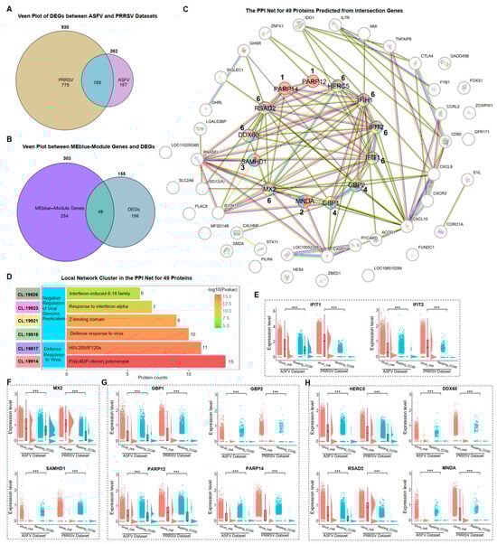 Negative regulation of ASFV and PRRSV genome replication in PAMs. (A) The veen plot of DEGs in the Virus_Cell group between ASFV and PRRSV datasets. (B) The veen plot between the MEblue-module genes and the common DEGs in both datasets. (C) The PPI network for 49 proteins predicted from the intersection genes from (B). (D) The local network cluster in the PPI network based on the biological processes (BP) of GO, colored to show the “CL” information and shown in (C) for those genes belonging with different “CL”. (E–H) The ridge plots of IFIH1, IFIT1, IFIT2, MX2, SAMHD1, GBP1, GBP2, PARP12, PARP14, HERC5, DDX60, RSAD2, and MNDA in the cellular groups of Virus_Cell and Resting_CC00 in two datasets, respectively. Significant differences were denoted by *** (p < 0.001).