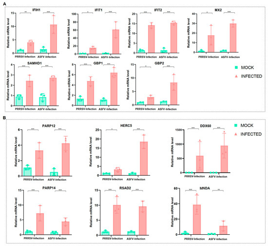 Validation of crucial gene expressions on PAMs by two viral infections. (A) The gene expressions of PAMs under PRRSV and ASFV infections from qRT-PCR results, including IFIH1, IFIT1, IFIT2, MX2, GBP1, GBP2, and SAMHD1. (B) The gene expressions of PAMs under PRRSV and ASFV infections from qRT-PCR results, including PARP12, PARP14, HERC5, DDX60, RSAD2, and MNDA. Significant differences were denoted by * (p < 0.05), ** (p < 0.01), and *** (p < 0.001).