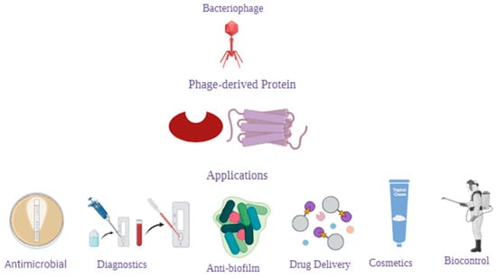 Bacteria-infecting viruses known as bacteriophages (phages) are found widely in nature. In their lytic life cycle, they kill their hosts. Over the years, this function has generated great interest in using them as antimicrobial agents to combat antibiotic resistance in bacteria [30,31]. Their application can be extended to numerous functions (Figure 1), including but not limited to: (i) detection of pathogens in the environment or food [32], (ii) disinfection of medical apparatuses and devices, (iii) prevention of the formation of bacterial biofilms on industrial surfaces [32,33,34], or (iv) vehicles for drug delivery [30,35,36].