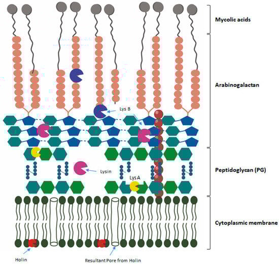Structure of the mycobacterium cell envelope with a graphic elucidation of the biological/mode of action. LysA, which acts on the PG cell wall and hydrolyzes the glycoside bonds. LysB disrupts the bonds between mycolic acids and the arabinogalactan layer. Holin attaches to the cell wall, and the resultant pores are observed.