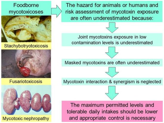 Foodborne diseases due to underestimated hazards from combined mycotoxin exposure, e.g., synergistic mycotoxin interaction, masked mycotoxins, and neglected hygiene control [].