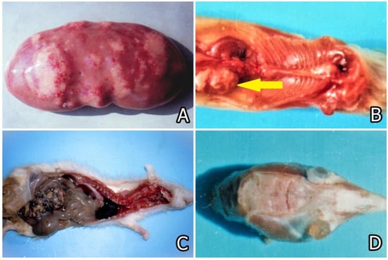 (A) Neoplasia (fibroadenoma and fibroma) in spontaneous cases of MPN in Bulgaria []; (B) A kidney with adenocarcinoma (pale protruding neoplastic areas on kidney surface) in a rat treated with 5 mg/kg OTA via the consumed feed during an experimental period of 24 months [,]; (C) Intestine with adenocarcinoma (large protruding pale neoplasia on intestinal surface) in a rat treated with 10 mg/kg OTA via the consumed feed during an experimental period of 19 months []; (D) An eye with squamous cell carcinoma in a rat treated with 10 mg/kg OTA via the consumed feed during an experimental period of 24 months [].