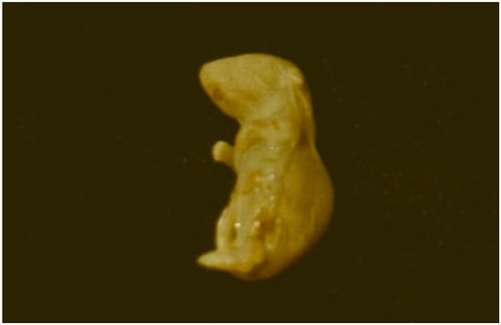 It is worrying that a lot of mycotoxins have carcinogenic (Figure 5), genotoxic, teratogenic (Figure 6), and immunosuppressive properties in addition to their acute toxic action [,,,,,,,]. A good example in this regard is FB1, which is suspected to provoke human esophageal cancer in South Africa [] and to induce liver carcinomas in rats [], in addition to its nephrotoxic effect [,]. The available data in the literature investigated mostly the carcinogenic effect of single and, rarely, double mycotoxin exposure via in vitro studies [], but in vivo studies investigating the chronic effect of multiple mycotoxins on the induction of neoplasia are scarce [,,].