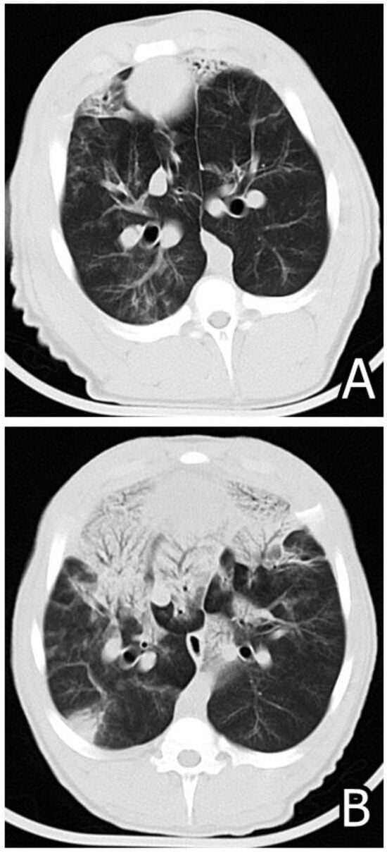 (A) Computed tomography (CT) photo of lung damages in M. hyopneumoniae experimentally compromised pig in a definite sectioning plane done on day 58 of the experiment showing small focal damages with patchy ground glass opacification. (B) CT photo of the lung damages in M. hyopneumoniae experimentally compromised pig treated additionally with 20 mg/kg FB1 via the consumed feed conducted in the same sectioning plane on day 58 of the experiment showing severe worsening of pneumonic changes as seen from the enlargement of the same damage [,].