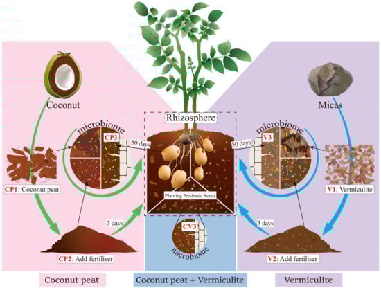 Samples were obtained from the soilless potato cultivation experimental greenhouse at Gansu Agricultural University. The sample processing flow is summarized in Figure 1. Initially, three substrate types were prepared: pure coconut peat (CP1), pure vermiculite (V1), a 1:1 mixture of coconut peat and vermiculite (CV1). These were stored without base fertilizer. Subsequently, a base fertilizer (15-15-15 compound fertilizer, contains 15% nitrogen, 15% phosphorus and 15% potassium) was added to each substrate and allowed to ferment outdoors for three days (everage daily temperature: 24 °C). Post-fermentation, samples were collected from these substrates: coconut peat with base fertilizer (CP2), vermiculite with base fertilizer (V2), a 1:1 mixture of coconut peat and vermiculite with base fertilizer (CV2). Healthy seed potatoes of the Feiwuruita variety, consistent in size, shape, and weight and free from surface diseases, were planted in these fermented substrates. The substrates were irrigated every five days. After 50 days, five potato plants from each substrate type were randomly selected, and samples from the substrate attached to their fibrous roots and tuber surface were collected, resulting in three groups of rhizosphere samples: CP3: planted potatoes in CP2 for 50 days, V3: planted potatoes in V2 for 50 days, CV3: planted potatoes in a 1:1 mix of coconut peat and vermiculite with organic fertilizer for 50 days. Samples from each period (CP1~CP3, V1~V3, CV3, totaling seven types) were mixed evenly and divided into three equal parts (each >100 g), representing three replicates. All samples were transported on dry ice and stored at −80 °C until further analysis.