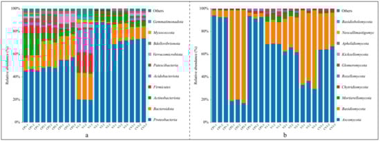 Bar graphs depicting the top ten phyla by relative abundance under various treatments: (a) Bacterial relative abundance; (b) Fungal relative abundance.