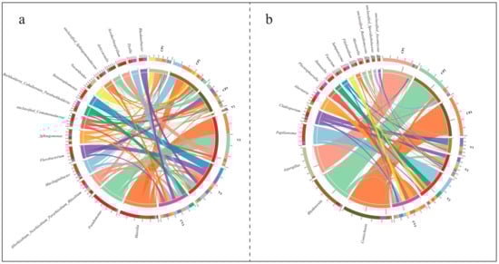 Distribution and chord diagrams illustrate the top 15 genera by relative abundance under various treatments. The left half of the diagram showcases the top 15 fungal genera in relative abundance across all samples, with different colors in adjacent curved columns representing different sample groups. A greater color proportion suggests a higher frequency of sequences from that genus in the respective group. The right half depicts different sample groups, where colors in adjacent curved columns denote different fungal genera. Here, a greater color proportion indicates a higher relative abundance of that genus within the group. The colors in the central band match the fungal genera’s colors, showing the association between genera and sample groups. The band’s thickness reflects relative abundance, with thicker bands denoting a higher relative abundance. (a) Bacteria; (b) Fungi.
