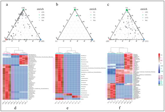 In contrast, ASV enrichment in the vermiculite matrix (Figure 5b) showed a different pattern, with 4 ASVs enriched in V1, 72 in V2, and only 3 in V3’s rhizosphere soil. These ASVs were classified into 3, 25, and 3 genera, respectively, yielding 19 PGPRs (Tables S4d and S5e). The majority of these PGPRs were found in V2 (Figure 5e), possibly due to high concentrations of phosphorus, potassium, and nitrogen, as well as a large species base number.