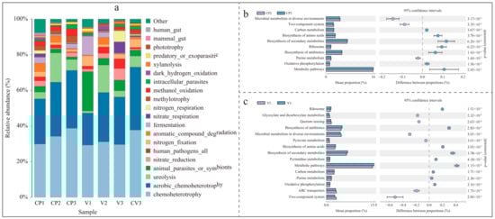 This figure illustrates the changes in bacterial community functions and metabolic pathways (species with relative abundance >1%, p < 0.05, a pairwise comparison between KEGG metabolic pathways in CP2 (or V2) and CP3 (or V3) was performed by applying t-test). (a) FAPROTAX environmental function analysis of bacterial communities under different treatments, highlighting the top 20 functional distributions by relative abundance. (b) Differential metabolic pathways in the coconut peat sample with base fertilizer added for 3 days (CP2) and the rhizosphere sample after 50 days of potato cultivation (CP3). (c) Differential metabolic pathways in the vermiculite sample with base fertilizer added for 3 days (V2) and the rhizosphere sample after 50 days of potato cultivation (V3).