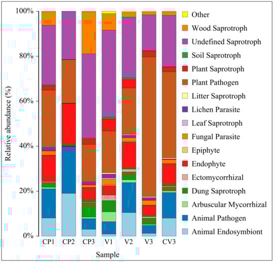 Utilizing the FunGuild database, the analysis and visualization of fungal nutritional composition (relative abundance > 0.1%) under different environments were conducted (Figure 7), representing over 99% of the functional composition (Table S5d). In coconut peat, compared to CP1, the abundance of Animal Endosymbiont, Animal Pathogen, and Endophyte in CP2 (with added base fertilizer) increased, while the abundance of 13 other functions decreased, particularly Undefined Saprotroph and Wood Saprotroph. Except for Plant Pathogen, other nutritional types followed a similar trend in pure vermiculite (V1) and vermiculite with added base fertilizer (V2). In CP3, compared to CP2, the abundance of Dung Saprotroph, Undefined Saprotroph, and Wood Saprotroph (all Saprotrophs) increased, while the abundance of Animal Endosymbiont, Animal Pathogen, and Endophyte decreased, possibly due to continuous nutrient consumption. Differing from coconut peat, in the vermiculite-based groups, V3 did not show an increase in Dung Saprotroph, Undefined Saprotroph, and Wood Saprotroph compared to V2. Specifically, Undefined Saprotroph decreased significantly, and Plant Pathogen increased, which may be due to vermiculite’s lack of TOC and other physicochemical properties. Additionally, across the three rhizosphere samples, as the proportion of coconut peat increased and vermiculite decreased (V3→CV3→CP3), the relative abundance of Plant Pathogen decreased while Undefined Saprotroph increased.