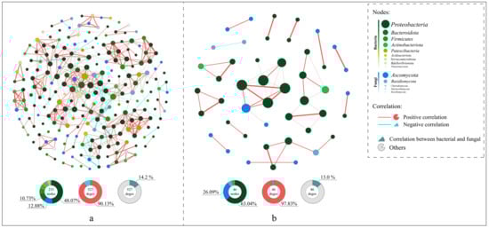 The co-occurrence network analysis and visualization include OTUs appearing in four or more groups, with Spearman’s coefficient (r) > 0.6 and an adjusted (BH) p-value < 0.01. In the network, green nodes represent bacteria, blue nodes represent fungi, and the size of each node indicates the relative abundance of the corresponding OTU. Red edges indicate positive correlations, blue edges indicate negative correlations, and edge thickness represents the strength of the correlation. (a) Co-occurrence network in the coconut peat substrate (CP1~CP3); (b) Co-occurrence network in the vermiculite substrate (V1~V3).