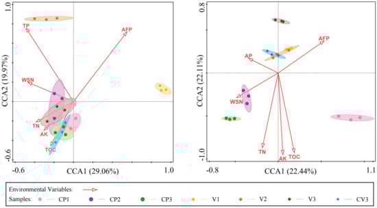 Canonical correspondence analysis (CCA) further validated the significant influence of environmental factors on microbial communities at the genus level. In the bacterial community (Figure 9 left), factors such as AFP, TP, WSN, TN, AK, and TOC showed significant correlations, together explaining a major part of the variation (Table S6a). For the fungal community (Figure 9 right), AFP, AP, WSN, TN, AK, and TOC were significantly correlated, collectively accounting for a large proportion of the variation (Table S6b). Constrained analysis revealed that the first two axes accounted for 49.03% and 42.55% of the variation in bacterial and fungal communities, respectively. Notably, the bacterial community exhibited two distinct groupings based on environmental factor influences: CP1~CP3, V3, and CV3 demonstrated similar responses with significant positive correlations to TN, AK, TOC, and a negative correlation to AFP. Conversely, V1 and V2 showed opposing characteristics. In the fungal community, the primary factors affecting CP2 and CP3 were WSN and AFP, with a significant positive correlation to WSN and a negative correlation to AFP. V13, and CV3 exhibited significant positive correlations with AP and AFP, and negative correlations with TN, AK, and TOC. The fungal community in CP1 responded differently to environmental factors compared to the other groups.