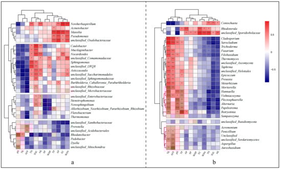 This heatmap illustrates the correlations between environmental factors and species based on Spearman’s analysis. Clustering, based on Euclidean distance, was performed separately for rows and columns, with row clustering grouping similar fungal genera. Each cluster represents a set of genera that share closer correlations with specific environmental factors. (a) Interrelationships between the top 30 bacterial genera in relative abundance and environmental factors; (b) Interrelationships between the top 30 fungal genera in relative abundance and environmental factors. Red indicates a positive correlation, while blue signifies a negative correlation. Significance was analysed using the BH-corrected p-value: “***” denotes p < 0.001, “**” p < 0.01, “*” p < 0.05, and unmarked correlations are not significant.