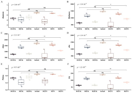 Alpha diversity of the microbial community during composting. (A) Shannon index. (B) Richness. (C) Chao index. (D) obs (observed species). (E) Pielou index. (F) Pd (Phylogenetic diversity) index. (ns means not statistically difference, * means the level of difference was at 0.05, ** means the level of difference was at 0.01.).