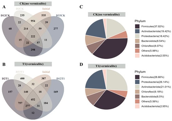 Community structure composition of composting. (A,B) Venn diagrams of OTUs in different composting phases of CK and T1, respectively; (C,D) communities at phylum level of CK and T1, respectively. (OTUs means operational taxonomic units, one OTU can represent one bacterial classification).