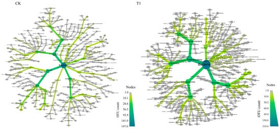 To understand the resemblance and specificity of the species distribution of microbial communities in T1 and CK treatments, a β-diversity analysis was conducted to gain insights into species variation [29]. As depicted in Figure 2A,B, the shared OTUs in different composting phases of CK and T1 were 222, and 452, respectively, and the difference between CK and T1 groups was 230, and the latter was much greater than the former. This suggested that vermiculite improves the composting microenvironment to promote the growth of bacteria responsible for organic matter metabolism during the co-composting process. As depicted in Figure 2C,D, the predominant phyla in CK and T1 treatments all were Firmicutes, Actinobacteria, and Proteobacteria, which were consistent with most composting studies [23,30], and their relative abundances were 37.02%,19.42%, 18.42% for CK, and 28.66%, 26.14%, 21.01% for T1, respectively. The vermiculite addition did greatly change the relative abundances of predominant species of core community during the co-composting. Compared to CK, Proteobacteria and Actinobacteria were higher and Firmicutes were lower in T1. Vermiculite enhanced the ability of Actinobacteria and Proteobacteria to resist unfavorable conditions, facilitating the breakdown of lignocellulose [31], organic matter decomposition, and nitrogen cycling [32]. The species classification tree analysis (Figure 3) demonstrated that T1 more than CK had greater trunks and branch abundances, and vermiculite significantly enhanced the abundance and balance of the microbial species involved in the co-composting process, and especially promoted core species Alphaproteobacteria, Gammaproteobacteria, Actinobacteria, and Bacilli in the co-composting system.