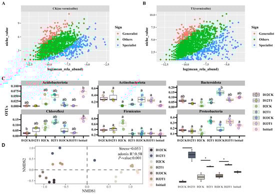 The evolution of microbial species with the composting process in CK and T1 treatments, respectively. (A,B) Specialist and generalist species; (C) analysis of species differences at the phylum level (Top six); (D) NMDS analysis of bacterial communities at different composting periods. (NMDS means non-metric multidimensional scaling, * means the level of difference was at 0.05. Letter differences indicate whether there is a difference between the two treatments. Lowercase letters represent the statistical level at 0.05.).