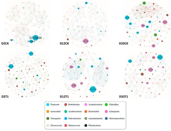 Different nodes play different topological roles in co-network, and module topology analysis is important for the identification of key taxa in the composting process [37]. In the module topology of the co-network, peripherals may be specialist species, and connectors and module hubs are closer to generalist species that play an important role in network topology as keystone species [36,39]. As seen in Figure 6, almost all keystone species belonged to connectors and module hubs during co-composting. In the CK group, a total of 24 (5 + 12 + 7) connectors were detected within the ecological networks, and 5, 12, 7 connectors corresponded to D2CK, D12CK, D33CK, respectively, and the predominant taxa identified among these important species were associated with Firmicutes (16), Bacteroidota (4), Actinobacteriota (2), Verrucomicrobiota (2), and Proteobacteria (1). In the T1 group, a total of 52 (18 + 3 + 31) connectors and one module hub were detected within the ecological networks, and 18, 3, and 31 connectors corresponded to D2T1, D12T1, D33T1, respectively, and one Module hub existed in D12T1, and the predominant taxa consisted of Proteobacteria (18), Firmicutes (16), Actinobacteriota (10), Bacteroidota (4), Verrucomicrobiota (2), Chloroflexi (2), Cyanobacteria (1). These microorganisms that played the role of connectors were dominated by Firmicutes, Proteobacteria, Bacteroidota, and Nitrospirota. In terms of the number of connectors, D2T1 > D2CK, D33T1 > D33CK, and although D12CK > D12T1, one module hub (super-generalist) existed in D12T1. Obviously, vermiculite contributed to a great increase in potential functional Proteobacteria and Actinobacteriota in T1, while Firmicutes was a common keystone species in CK and T1; at the same time, vermiculite made the ecological function network diversified at the waring and maturation phases, and complicated and compacted at the thermophilic phase. Thereby, vermiculite enhanced community functions by strengthening the co-network of keystone taxa to adapt to the change in the composting environment stress [18], promoting substrate transformation and humification of the co-composting.