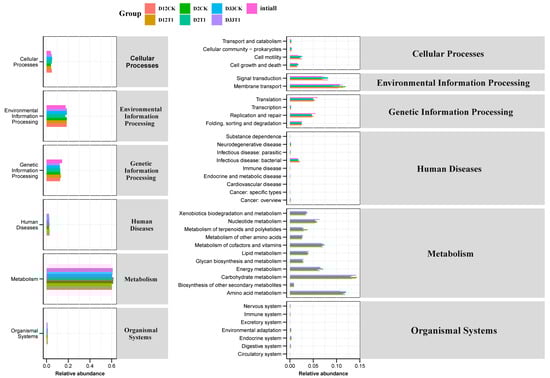 The potential functional and metabolic pathways of microbial communities were investigated using KEGG analysis during co-composting [40], as shown in Figure 7. Regardless of whether vermiculite was added or not, the relative abundances of functional genes related to metabolism pathways, environmental information processing, genetic information processing, and cellular processes accounted for 60.09–61.64%, 17.3–18.74%, 12.07–14.32%, and 3.93–5.08%, respectively. Among them, the abundance of functional genes related to metabolic pathways was the highest (>60%). The effect of vermiculite did not seem to be significant from the point of view of the primary metabolic pathway. The secondary metabolic pathways showed that the functional genes with high abundance were related to carbohydrate metabolism, amino acid metabolism, cell membrane transport, and signal transduction in turn. They were notably higher in T1 than CK. This was due to the fact that vermiculite promoted Bacillus, Pseudoxanthomonas, Saccharomonospora, Streptomyces, Ochrobactrum, and Nonomuraea, mentioned above. As demonstrated by Yin et al. (2019), the breakdown of lignocellulose is positively influenced by carbohydrate metabolism, and composting maturation is closely linked to the metabolism of amino acids [41]. So, the KEGG metabolic pathway analysis indicated that vermiculite promoted the degradation of organic matter (carbohydrate and amino acid metabolisms) in composting and composting maturity. This is consistent with the results of our determination of the physicochemical properties of composting.