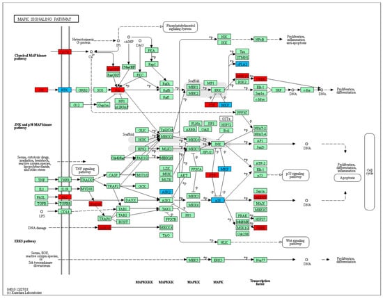 MAPK signaling pathway (KEGG: 04010) enriched in bovine fibroblasts infected with B. besnoiti. DEGs at 12 h p.i. is represented in blue and DEGs at 32 h p.i. in red.