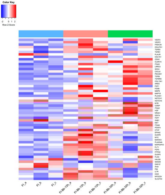 At 32 p.i., the comparison between FI-Bb and FI demonstrated an enrichment of processes related to cell adhesion. KEGG pathway analysis unveiled several pathways, including “Focal adhesion”, “Cell adhesion molecules, “PI3K–AKT signaling pathway” and the “Malaria” (HGF–MET signaling pathway). Some upregulated genes were also upregulated at 12 h p.i (FOSB, PLCXD1, TGFβ1). Particularly at 32 h p.i, there was a significant upregulation of several adhesion molecules (CDH2, CLDN15, ITGA2, ITGA5, ITGA6, LRRC4, SDC4, PECAM1), genes associated with fibrosis (TGFβ1, TGFβ3, transforming growth factor β receptor 2—TGFβR2—, PLAUR, collagen type XIII A1—COL13A1—, matrix metallopeptidase 16 (MMP16) and cell proliferation (FOSB, Amphiregulin—AREG—) (Figure 2).