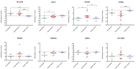 The expression of a set of selected DEGs from the RNA-Seq data (AREG, FGF1, FOSB, MMP9, MMP16, PLAUR, PLCXD1, TGFβ1) was analyzed in scrotal skin samples from naturally infected bulls []. Among the eight genes examined, three showed distinct regulatory patterns in the scrotal skin of naturally infected bulls. Specifically, PLAUR exhibited upregulation in both acutely and chronically infected bulls when compared to the non-infected group. Moreover, TGFβ1 was found to be upregulated in chronically infected bulls compared to the non-infected group. In contrast, only FOSB showed downregulation in chronically infected bulls. Notably, the remaining assessed genes (FGF1, FGF1, MMP9, MMP16, AREG, PLCXD1) did not display significant expression changes when infected and non-infected animals were compared (Figure 3).