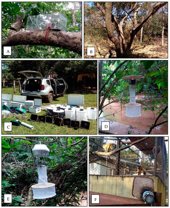 Traps used for collection of non-human primates and mosquitoes in MS and MT during 2017–2018. (A,B) Tomahawk traps distributed in trees during non-human prmates collection in MT. (C–F) BG-Sentinel Traps, CDC light, CO2 CDC, and resting traps, respectively (credit: Alex Pauvolid-Corrêa and Helver Dias).
