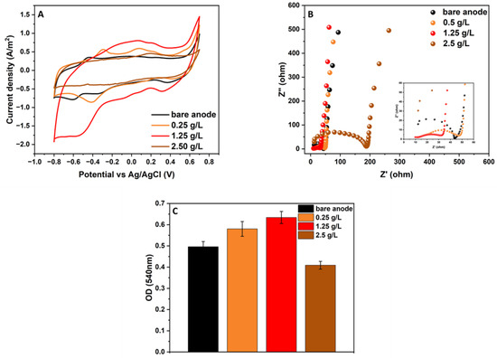 Other studies have found improved bio-electroactivity in MFCs with a graphite-modified anode. Mahmoud et al. operated MFCs with three different carbon–felt anodes modified by doping with graphitic mesoporous carbon (2, 5, and 10 mg·cm