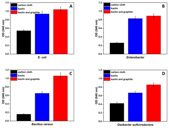 Pure cultures (0.15 OD at 660 nm) of Bacillus cereus (DSMZ 31), Enterobacter cloacae (DSMZ 30054), and E. coli (DSMZ 6899) were inoculated in 50 mL tubes with brain heart infusion (BHI) broth (Himedia, India) (37 g dissolved in 1000.00 mL of distilled water) (15 mL) and a 0.5 × 0.5 cm2 carbon cloth (ELAT Hydrophilic, FuelCellsEtc, TX, USA), a carbon cloth with kaolin (Sigma-Aldrich, St. Louis, MO, USA), and a carbon cloth with kaolin and graphite nanoparticles (Merck, Darmstadt, Germany). The samples were incubated for 48 h at 37 °C, and then the biofilm on the carbon cloth was gently washed with Dulbecco’s phosphate-buffered saline (Biological Industries, Kibbutz Beit-Haemek, Israel). The biofilm viability was examined using a colorimetric method based on the reduction of tetrazolium salt reagent by bacterial biofilm oxygenases. In this method, a reagent solution of 3-(4,5-Dimethylthiazol-2-yl)-2,5-diphenyltetrazolium bromide (MTT; Merck, Darmstadt, Germany) was added to the tubes, which were then covered with aluminum foil to avoid light penetration. The samples were placed in an incubator for two hours at 30 °C, and the MTT reagent was replaced by a DMSO–Ethanol (1:1) solution, followed by incubation for another 30 min. The absorbance intensity was measured at 540 nm. The same procedure was performed for G. sulfurreducens, except for incubation for 7 days at 30 °C in Geobacter medium in an anaerobic environment.