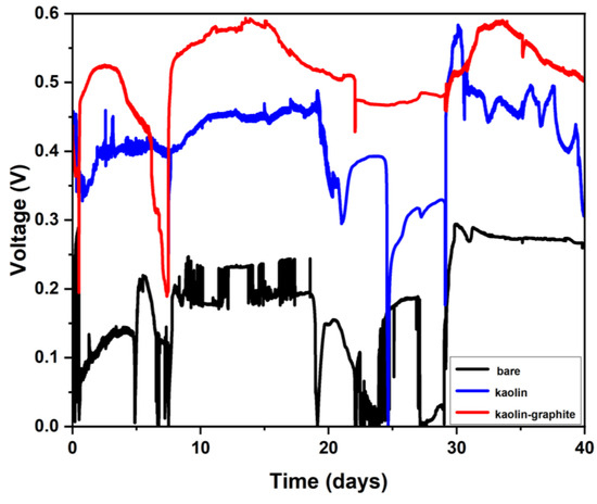 Electrodes were connected via titanium wires. The anode’s contact area and the titanium wires were sealed with epoxy material to ensure electric isolation. An aquarium pump was used to aerate the cathode chamber through a filter (0.45 mm pore size; Whatman, Piscataway, NJ, USA) to provide a sterilized environment. The MFCs were placed in a thermostatic bath at 30 °C. The anode chamber was placed on a magnetic stirrer (120 rpm) for continuous electrolyte stirring. The MFCs were fed with Geobacter medium supplied with sodium acetate (10 mM) as the carbon source, which was refreshed when the voltage dropped. The MFCs based on the kaolin–graphite anode, kaolin anode, and control anode were constructed in triplicates.