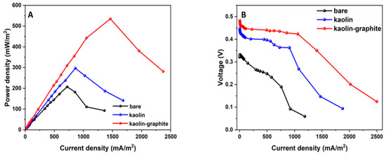 Figure 4A,B, it can be seen that the MFC based on the kaolin–graphite nanoparticle anode led to the highest performance, with a maximum power density of 0.54 W·m